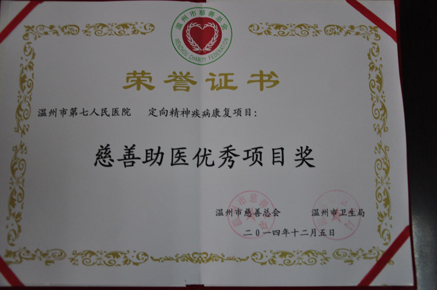 在慈善助醫(yī)表彰大會(huì)上,市慈善總會(huì)和市衛(wèi)生局對(duì)慈善助醫(yī)獲獎(jiǎng)單位和個(gè)人進(jìn)行了表彰,我院喜獲溫州市慈善助醫(yī)優(yōu)秀組織獎(jiǎng)、我院開展的定向精神疾病康復(fù)項(xiàng)目獲優(yōu)秀項(xiàng)目獎(jiǎng),我院醫(yī)務(wù)科科長(zhǎng)陳策和防治科科長(zhǎng)林春燕榮膺善助醫(yī)先進(jìn)個(gè)人獎(jiǎng)。