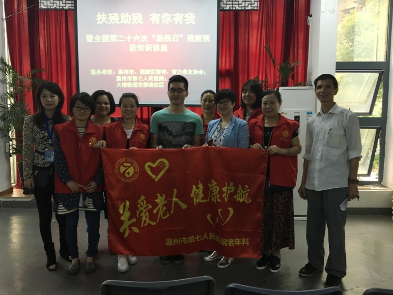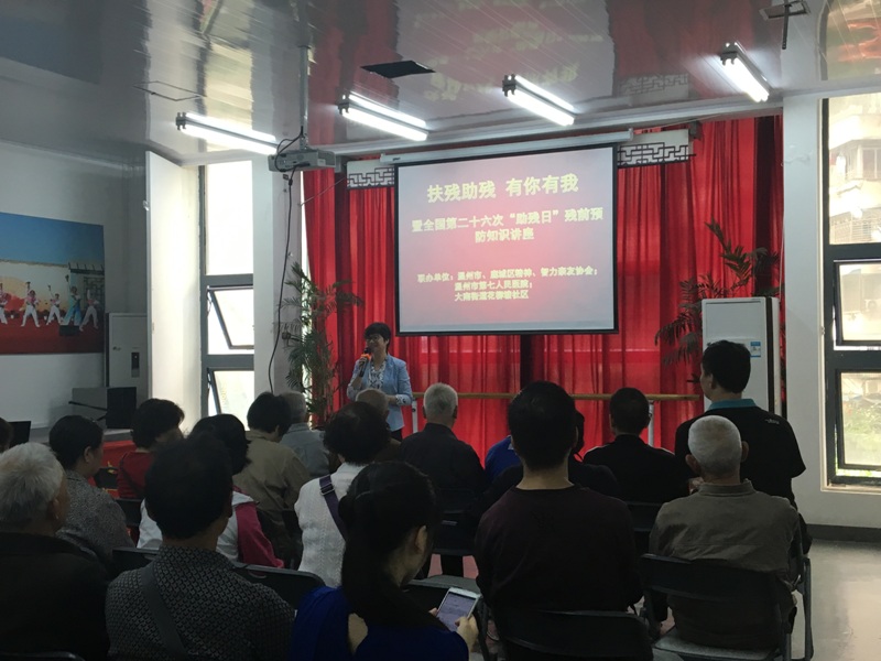 ? ? ? ??為迎接全國第二十六個“助殘日”,5月18日上午,我院聯(lián)合鹿城區(qū)精神、智力親友協(xié)會,在大南街道花柳塘社區(qū)開展殘前預(yù)防知識講座,共有130多名殘疾人及家屬、助殘志愿者在花柳塘社區(qū)活動中心多功能廳參加此次講座,講座由我院老年科護士長陳建敏主講。
