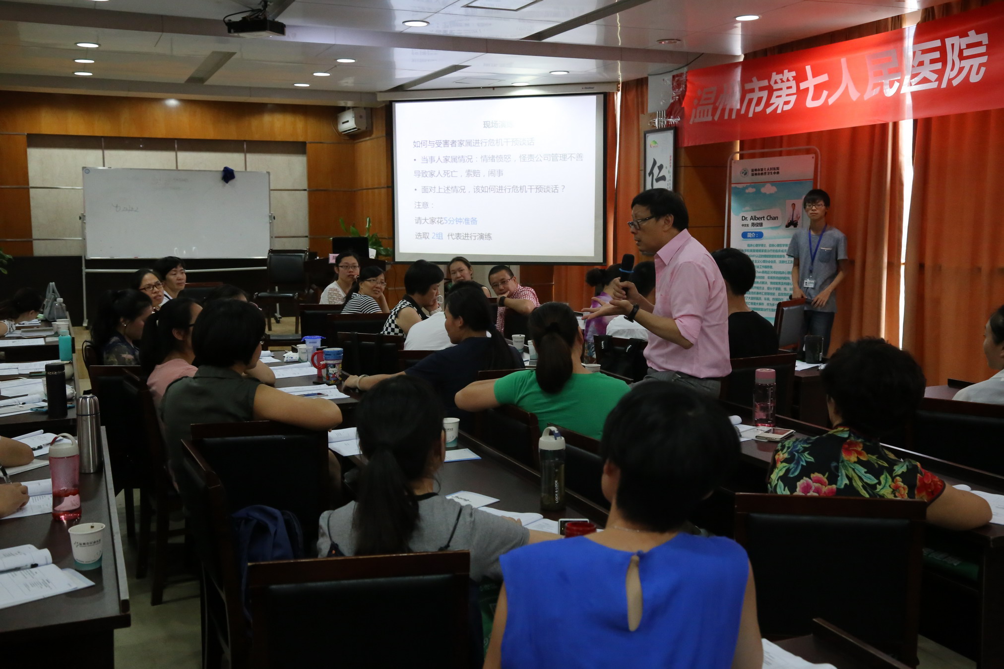 ? ? ? ?7月30日—8月1日,由溫州市衛(wèi)計(jì)委應(yīng)急辦牽頭,溫州市第七人民醫(yī)院、溫州市心理危機(jī)干預(yù)培訓(xùn)基地主辦的突發(fā)事件心理危機(jī)干預(yù)骨干培訓(xùn)班“NOVA系統(tǒng)危機(jī)干預(yù)培訓(xùn)班”成功舉辦,溫州市各縣、市(區(qū))骨干心理咨詢師、精神科醫(yī)護(hù)人員,我院心理危機(jī)救援隊(duì)成員等共60人參加了培訓(xùn)。