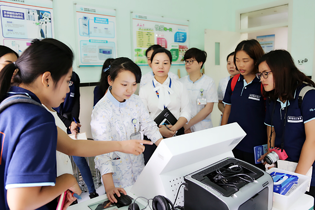 隨后,方春霞副主任陪同師生們參觀走訪了老年科、康復(fù)科。在老年科,師生們對老年癡呆患者的認知功能治療儀表現(xiàn)出了濃厚的興趣,他們聚精會神地觀看護士對儀器的操作和演繹,不時伸出大拇指稱贊。