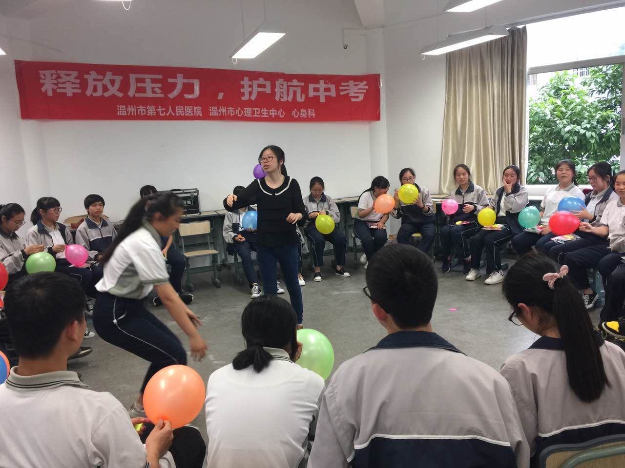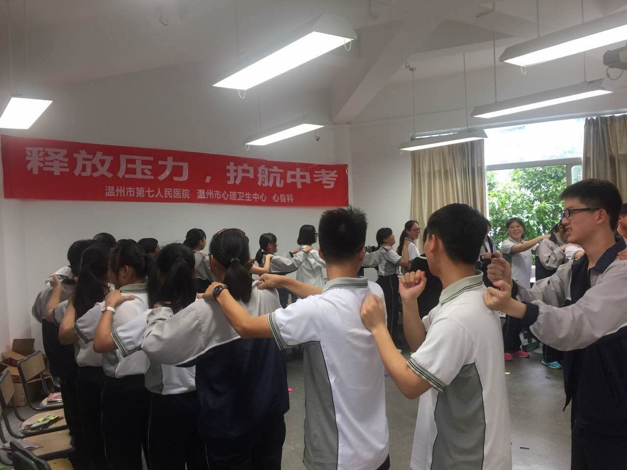 為了幫助和引導(dǎo)同學(xué)們擺脫和緩解這種狀態(tài),溫州市第七人民醫(yī)院心身科協(xié)調(diào)澤雅鎮(zhèn)組織部,為澤雅中學(xué)的初三學(xué)生開展了一次心理團體輔導(dǎo)活動,本次活動以“釋放壓力,中考護航”為主題,本次團輔由兩位咨詢師組織開展。