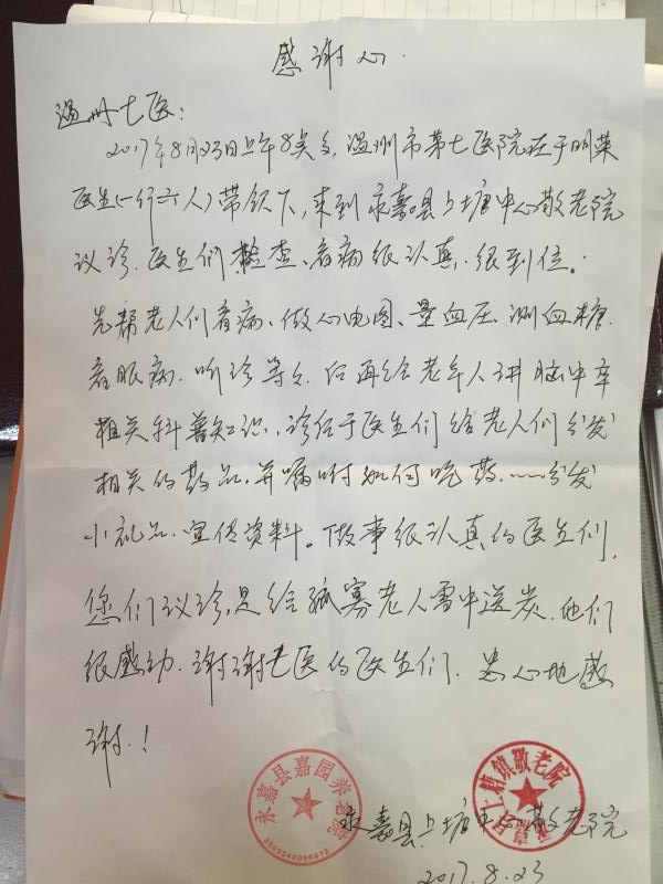 8月23日,我院“蒲公英之旅”第三站走進(jìn)永嘉縣上塘中心養(yǎng)老院。對(duì)于“七醫(yī)人”來(lái)說(shuō),這只是一次普通又平常的義診活動(dòng),卻意外收到一份特殊的“禮物”。