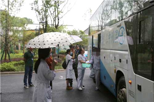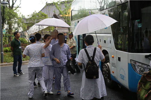 時隔一日,潘橋新院又迎來一批新“客人”。5月23日上午,細雨伴隨著涼意,兩輛救護車,以及兩輛大巴車從西山院區(qū)按時出發(fā)并在既定時間到達潘橋院區(qū)住院部樓下。9點20時許,院領導、職能科室,以及病區(qū)醫(yī)護人員,以及全院所有行政科室,均在住院大樓一樓等候,運載著二病區(qū)70多名患者大巴剛到,保衛(wèi)人員、醫(yī)護人員就早已等候就緒。住院樓門口的所有通道處,都駐守著特勤人員、安保人員,以及醫(yī)護和行政人員,以確保安全進行。