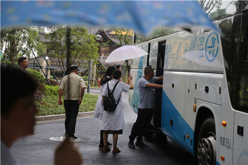 你瞧,醫(yī)院領導、醫(yī)護人員、安保人員已經(jīng)排成了一列小縱隊,就像一隊“迎賓人員”等候著病人。還有,更令人感動的是我們的醫(yī)護人員,早早得打起雨傘,等候著下車病人,一個一個撐著雨傘接送至住院大樓。