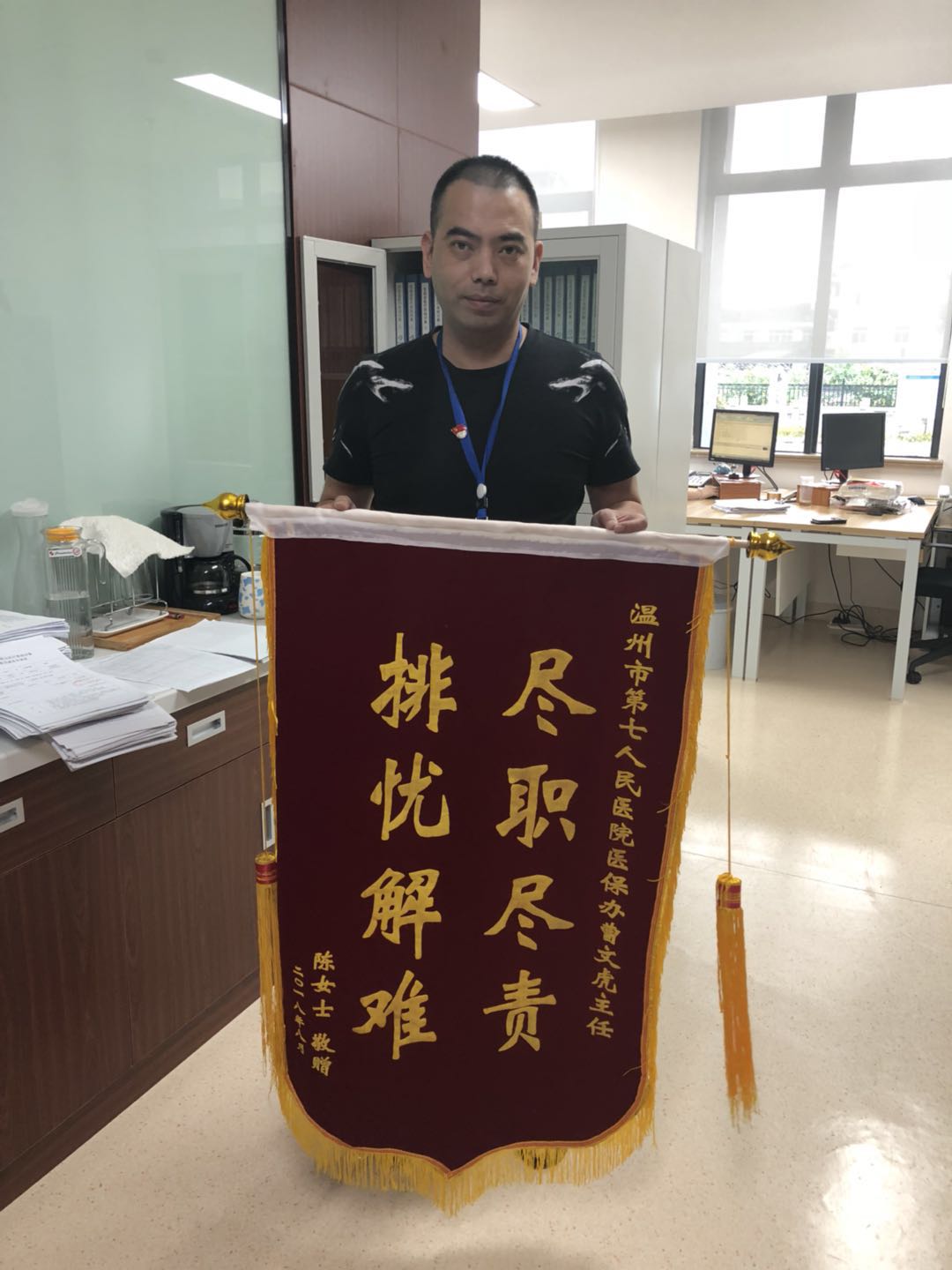 “謝謝醫(yī)院領(lǐng)導(dǎo),謝謝醫(yī)保辦,謝謝你們這些好政策?!卑橹@簡短的感激之言,8月24日上午,患者家屬陳女士將寫著“盡職盡責(zé) 排憂解難”的一面錦旗遞到了我院醫(yī)保辦曹主任的手中。