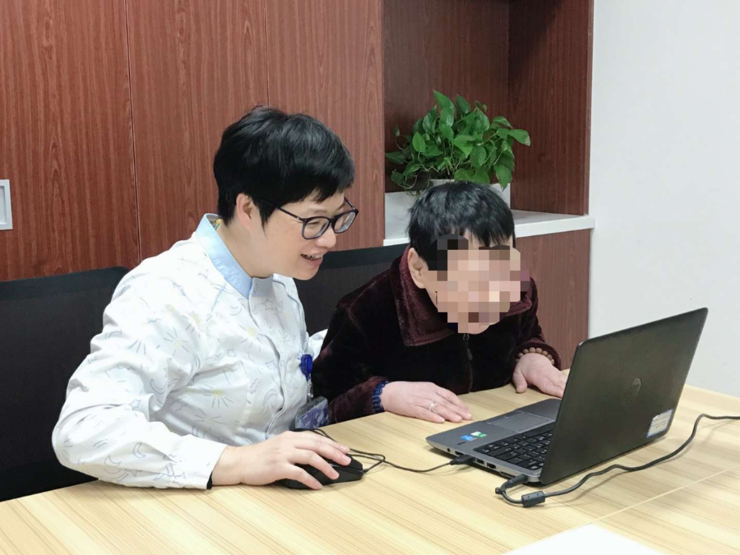 ?? ? ?早幾日,陳建敏護(hù)士長(zhǎng)在病房不斷穿梭,關(guān)切留院患者的心理所求,在知道小蘭內(nèi)心對(duì)家人的思念后,今天就給她送上豬年的第一份“專(zhuān)屬禮物”:在溫州市第七人民醫(yī)院八樓住院樓示教室內(nèi),小蘭正與她家人暖情視頻通話,雖然因?yàn)橹橇Φ拖碌年P(guān)系,小蘭不會(huì)表達(dá)一些深刻的情感,可是,對(duì)家人的愛(ài),幾乎就是不需要訓(xùn)練的,面對(duì)著顯示屏中的親人,她也會(huì)動(dòng)情地說(shuō):“小麗(患者妹妹、化名),真的很想你們了,你看這樣你們多好,你們不用跨洋來(lái)看我了。你放心,我在這個(gè)家里很好”,妹妹在海洋那一頭熱淚盈眶、哽咽不能語(yǔ),也是在這樣一次安排中,老年科的醫(yī)護(hù)人員一不小心也促成了小蘭人生中的第一次,她生平第一次見(jiàn)到了她素昧謀面、現(xiàn)在已經(jīng)是美國(guó)的一個(gè)檢察官的弟弟,畫(huà)面定格在“你說(shuō)你笑,你動(dòng)我懂”的溫馨鏡頭,而這個(gè)一幕真情的自然流露,難道不是最真摯的禮物嗎?