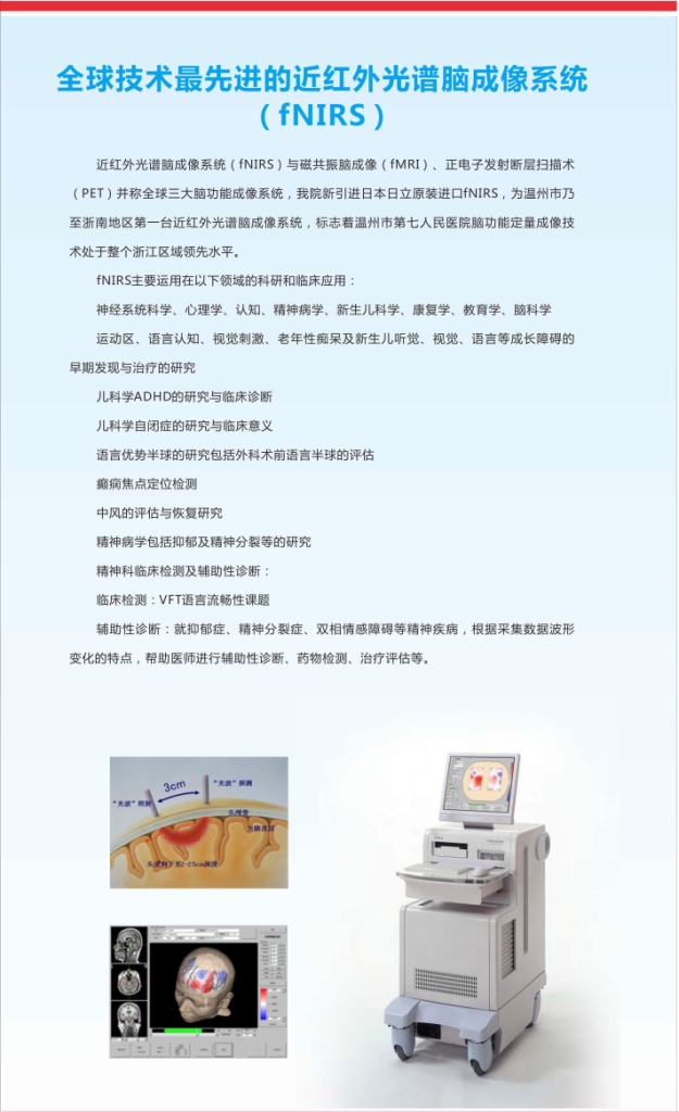 ??? 3月1日下午,我院邀請(qǐng)浙江大學(xué)醫(yī)學(xué)院附屬第一醫(yī)院精神科主任醫(yī)師許毅教授來指導(dǎo)交流,在徐象平書記、林小東院長(zhǎng)、姜德國(guó)副院長(zhǎng)及相關(guān)職能科室負(fù)責(zé)人的陪同下參觀了我院潘橋院區(qū)。在特檢科,特別了解了近紅外光譜腦功能成像系統(tǒng)(fNIRS)的功能和用法,fNIRS為溫州市乃至浙南地區(qū)第一臺(tái)近紅外光譜腦功能成像系統(tǒng),標(biāo)志著我院腦功能定量成像技術(shù)處于整個(gè)浙江區(qū)域領(lǐng)先水平。