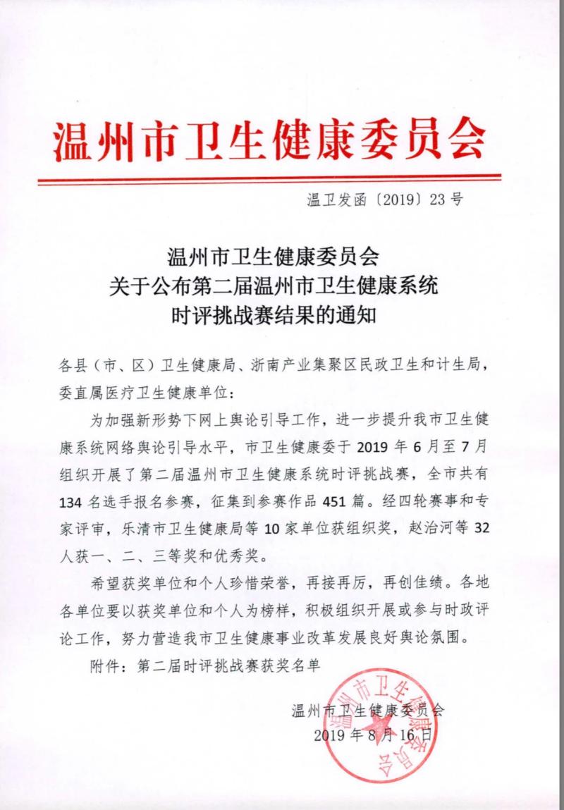 ??? 今年6月,溫州市衛(wèi)健委啟動第二屆全市衛(wèi)健系統(tǒng)時政評論賽,旨在通過實戰(zhàn)競賽形式,深入挖掘和培養(yǎng)一批本系統(tǒng)優(yōu)秀時政評論高手精英。本次賽事組委會邀請市委網(wǎng)信辦專家、資深媒體人組成評委會,評出個人獎、團體獎若干名,評委會每周從參賽作品中評選出兩篇優(yōu)秀作品作為每周之星,同時選出優(yōu)秀作品若干篇,并根據(jù)稿件質(zhì)量賦分。