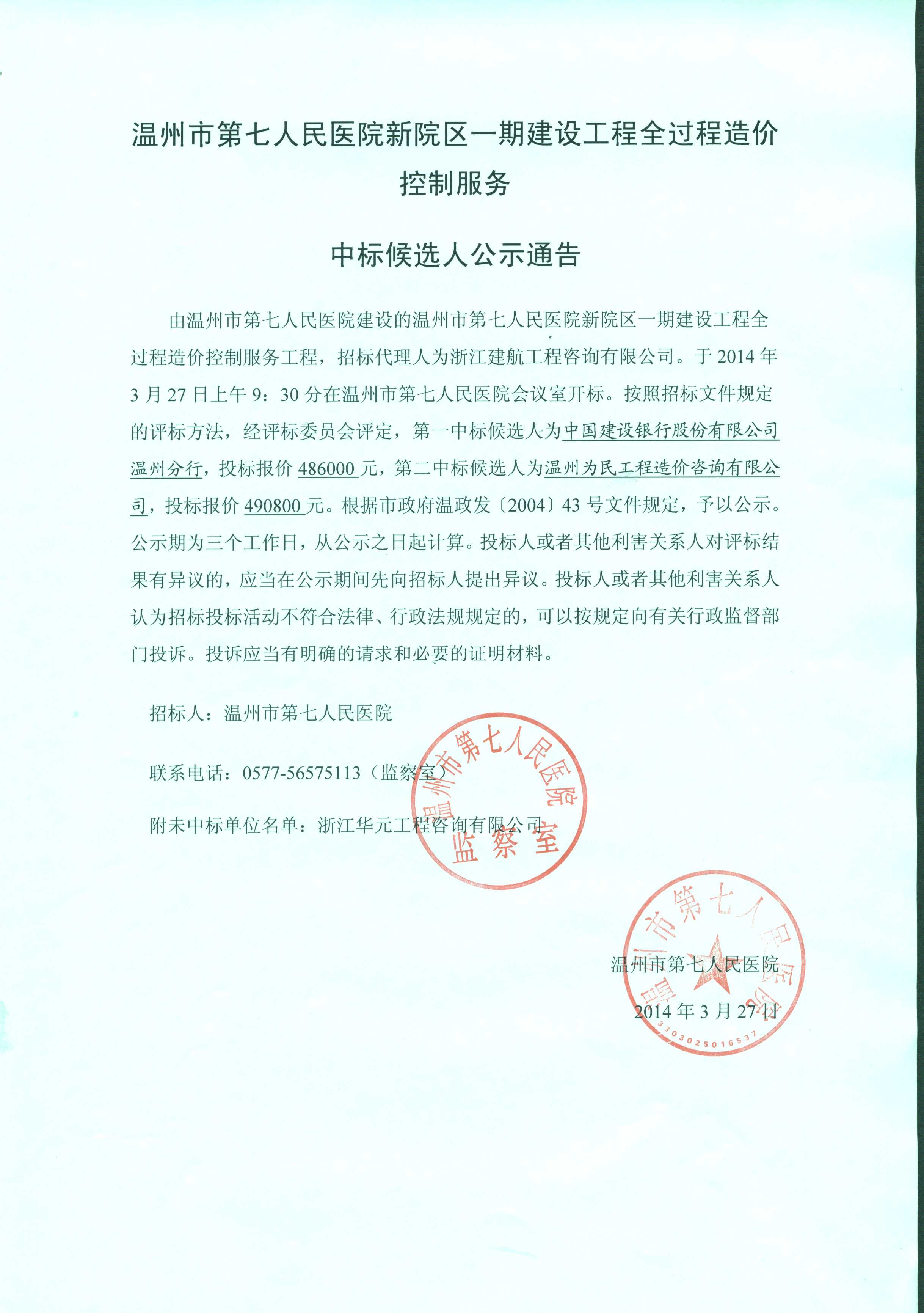 溫州市第七人民醫(yī)院新院區(qū)一期建設(shè)工程全過程造價(jià)控制服務(wù)