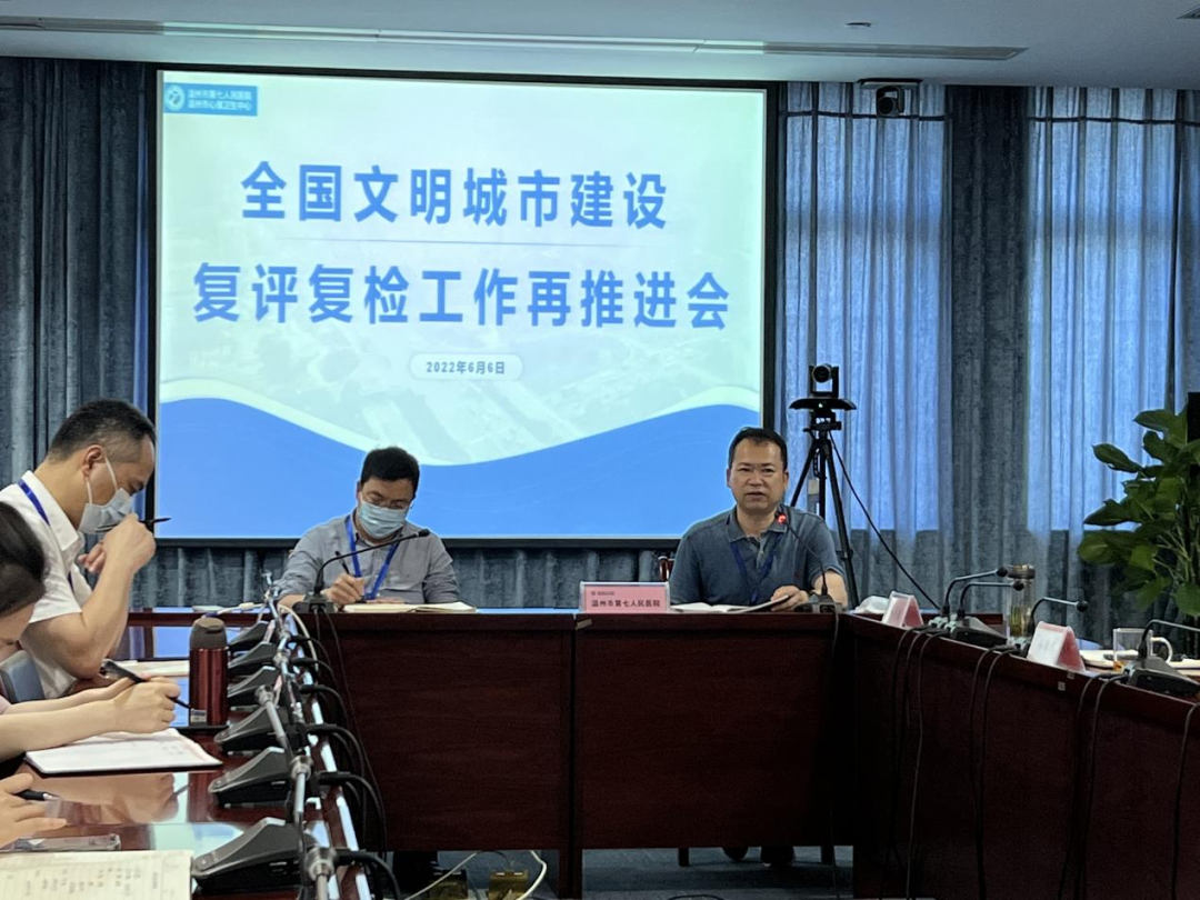 ? ? ? 為進(jìn)一步貫徹落實(shí)關(guān)于全國(guó)文明城市創(chuàng)建工作的部署要求,持續(xù)鞏固整改、提升成效,6月6日,溫州市第七人民醫(yī)院針對(duì)文明城市創(chuàng)建工作進(jìn)行再部署再推進(jìn),召開(kāi)全國(guó)文明城市建設(shè)復(fù)評(píng)復(fù)檢工作再推進(jìn)會(huì)議,并對(duì)醫(yī)院全國(guó)文明城市創(chuàng)建工作展開(kāi)檢查。院黨委書記林小東,院黨委副書記、院長(zhǎng)黃國(guó)永等領(lǐng)導(dǎo)班子成員及各職能科室負(fù)責(zé)人參加。