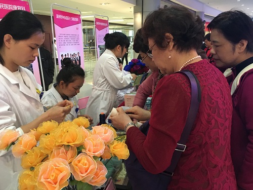 活動(dòng)中,我院工作人員手把手指導(dǎo)市民自己動(dòng)手制作絲網(wǎng)花、手鏈。并對(duì)患者制作的手工作品進(jìn)行展示和義賣。在活動(dòng)現(xiàn)場(chǎng),手工制作的絲網(wǎng)花受到了廣大女同胞的喜愛,她們紛紛表示親手制作手工花贈(zèng)送給親友和自己具有非常深刻的意義。