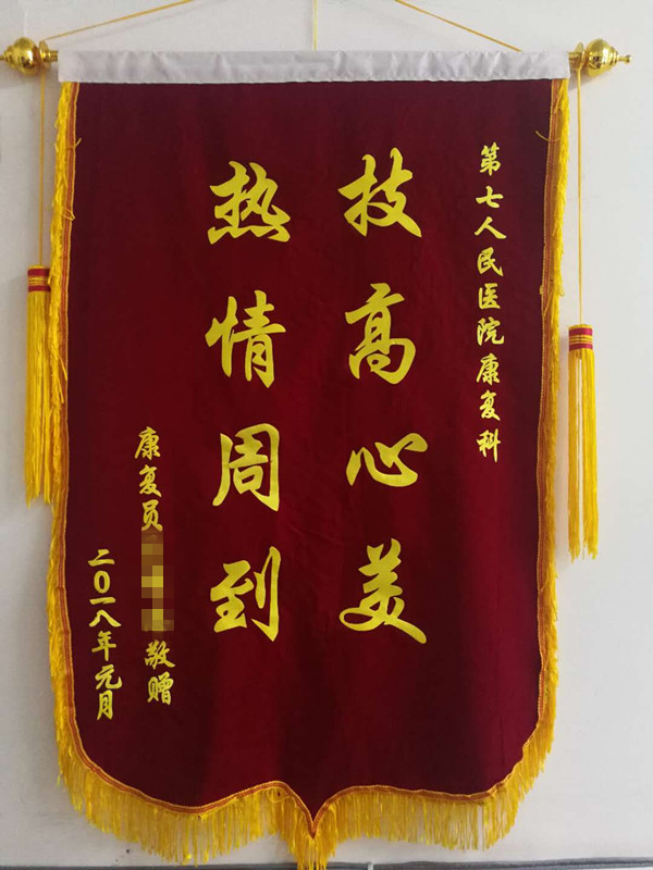 ???? “康復(fù)科的醫(yī)生和治療師們工作認(rèn)真負(fù)責(zé),醫(yī)術(shù)精湛,對(duì)病人服務(wù)態(tài)度很好,像對(duì)待家人一樣。”1月30日上午9時(shí),一位已出院患者王先生將一面寫有“熱情周到 技高心美”的錦旗送到康復(fù)科主任張麗君手中,并衷心感謝住院期間康復(fù)科全體醫(yī)護(hù)人員的精心治療和舒心照顧。
