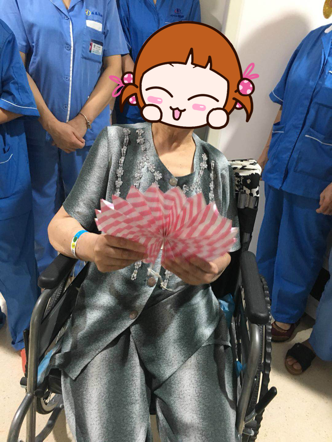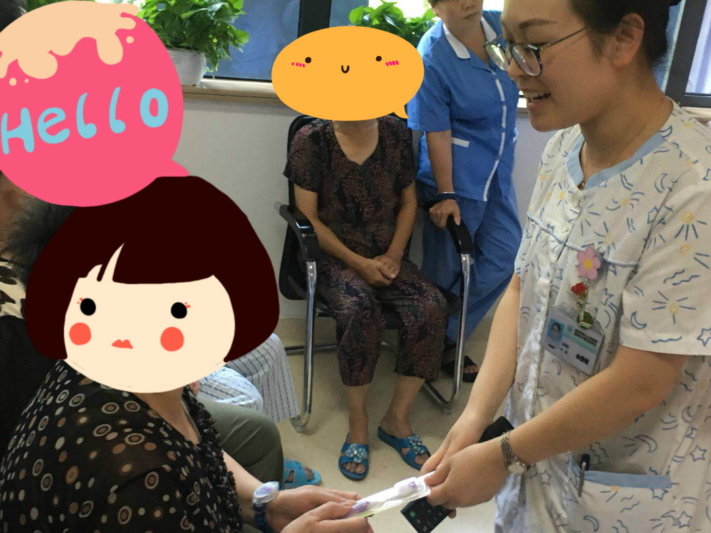 在護(hù)士的主持下,大家還一起猜燈謎,拿獎(jiǎng)品,好生熱鬧。護(hù)士問(wèn):“又圓又扁肚里空,活動(dòng)鏡子在當(dāng)中, 大人小孩都愛(ài)它,每天向它鞠個(gè)躬。(打一用具)”康復(fù)室里瞬間安靜下來(lái)在思考,突然一個(gè)阿婆說(shuō):“這是臉盆吧?!闭媸菣C(jī)智到不行,我們立即為她送上我們的準(zhǔn)備的獎(jiǎng)品。還有一個(gè)燈謎:“兄弟幾個(gè)人,各進(jìn)一道門, 那個(gè)進(jìn)錯(cuò)了,看了笑死人。(打一物)”,病人又快速的喊出“紐扣”。不得不佩服他們,機(jī)智如我們科這些可愛(ài)的老人家。
