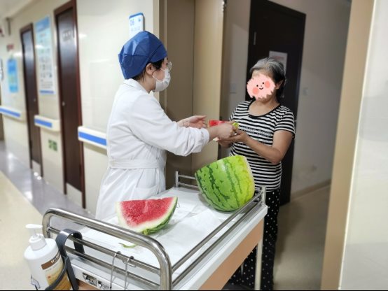 ? 抗疫以來,醫(yī)院就不允許病人家屬探視,只允許家屬將東西送到病區(qū)門口,由我們醫(yī)護(hù)人員接收,消毒后再帶到病房,不少家屬或多或少都有一兩句怨言,經(jīng)常會家屬問“到底什么時(shí)候可以探視” ,解釋后大部分都是能理解和配合的,這讓我們醫(yī)護(hù)人員的工作量大大減輕,也感到非常的欣慰。這天一位病人的家屬送來的生活用品及水果,病人為了感謝我們醫(yī)護(hù)人員堅(jiān)持要送我們一個大西瓜,我們表示了感謝但是東西我們不能收,我們病區(qū)嚴(yán)格遵守《九不準(zhǔn)》的醫(yī)療衛(wèi)生行風(fēng)原則,九不準(zhǔn)牢記在我們的心中,病人及家屬一再堅(jiān)持,最后我們以病人的名義將西瓜分享給病房里的病人、家屬及陪護(hù),一塊塊西瓜被分別發(fā)到大家的手中,讓大家消解暑氣,在這個炎熱的7月份給大家?guī)砹?/span>一絲絲清涼。