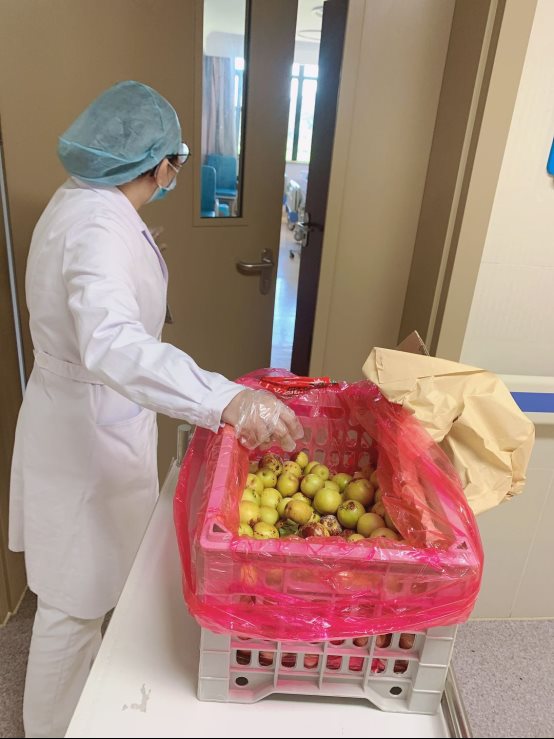? 幾經(jīng)勸說(shuō),家屬還是不愿離去,最后報(bào)告給監(jiān)察室以及征得家屬的同意,我們準(zhǔn)備把這些水果,分發(fā)給我們病區(qū)所有的病人,讓大家一起分享這份溫暖(因?yàn)楦綦x,里面的病人及陪護(hù)都不能正常進(jìn)出,購(gòu)買(mǎi)生活用品)??吹剿麄兡玫剿麜r(shí),那簡(jiǎn)單純粹的笑容,感染了我們每一位醫(yī)務(wù)人員。
