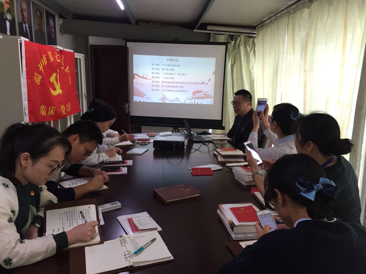 10月18日,舉世矚目的中國共產黨第十九次全國代表大會在北京召開,習近平總書記代表第十八屆中央委員會向大會做了《決勝全面建成小康社會奪取新時代中國特色社會主義偉大勝利》的報告。為深入學習貫徹黨的十九大精神,做好臨床相關黨建工作,11月10日上午,臨床第一支部在黨員會議室召開了“學習黨的十九大精神”的黨日活動。由胡立榮書記做報告,護理部方春霞主任主持,全體黨員參加,無缺席。