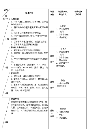 | 月份 周 | 培訓(xùn)內(nèi)容 | 培訓(xùn) 方法 | 培訓(xùn)老師及 考核方式 | 考核時(shí)間 及結(jié)果 |