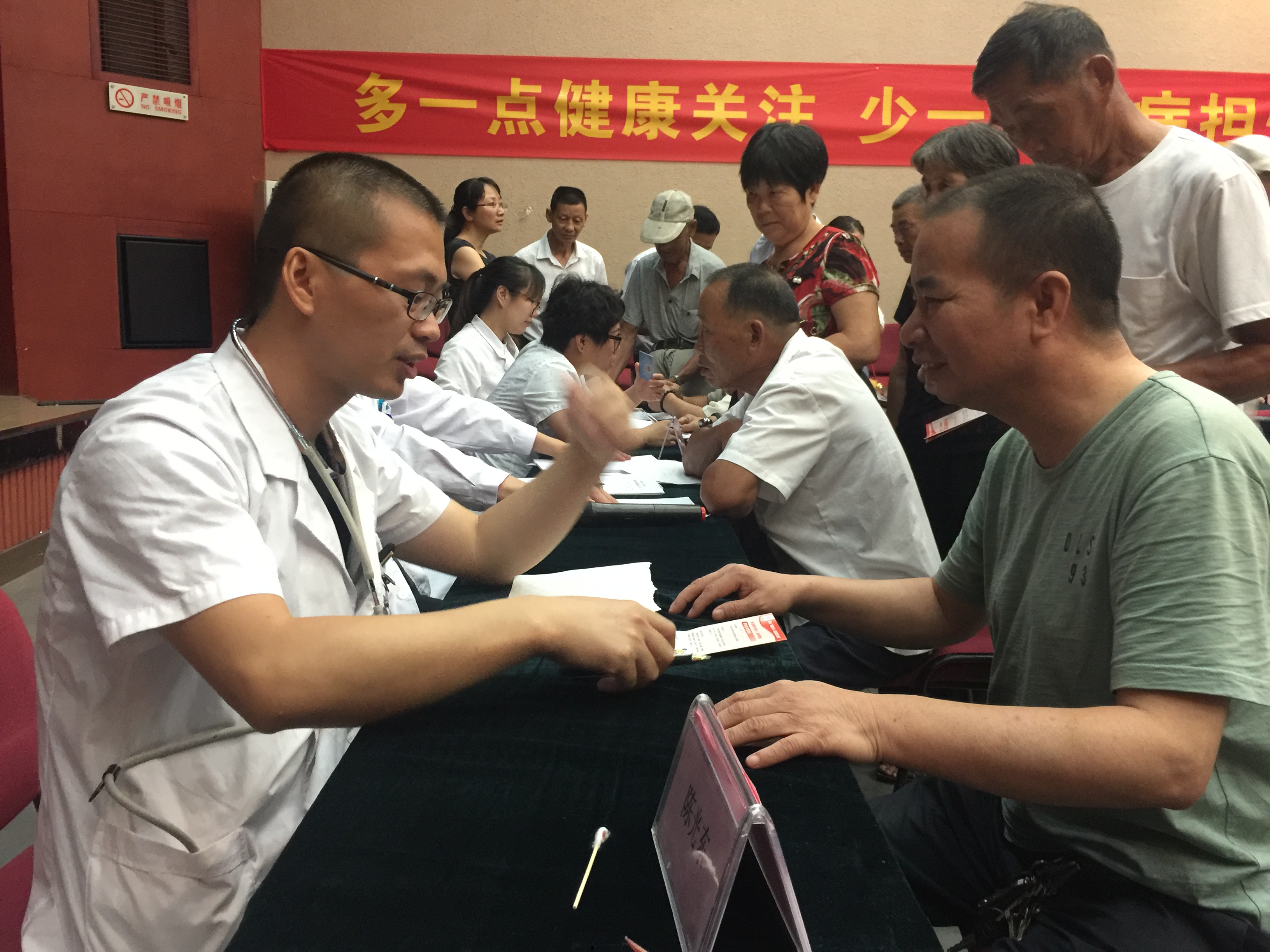 上午8:00,昆陽鎮(zhèn)太陽城多功能廳內(nèi)坐滿了當(dāng)?shù)氐睦先?,炎熱的酷暑抵也不住他們他們的熱情,?jù)說有位老人聽說溫州的醫(yī)生要來,早上四點就開鍋起灶,吃了早飯早早過來等候,工作人員快速就位后,副主任醫(yī)師坐診看診,其他人員井然有序的為老人們提供服務(wù),內(nèi)容涵蓋:測量血壓、血糖,心理篩查,發(fā)放避暑、降壓等藥物。