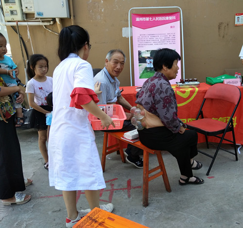 ??????????? 日前,龍灣區(qū)永中街道龍錦社區(qū)舉辦“惠民暖心 最美服務”基層義診活動,我院康復科“巾幗文明崗”志愿者們助力該項服務。