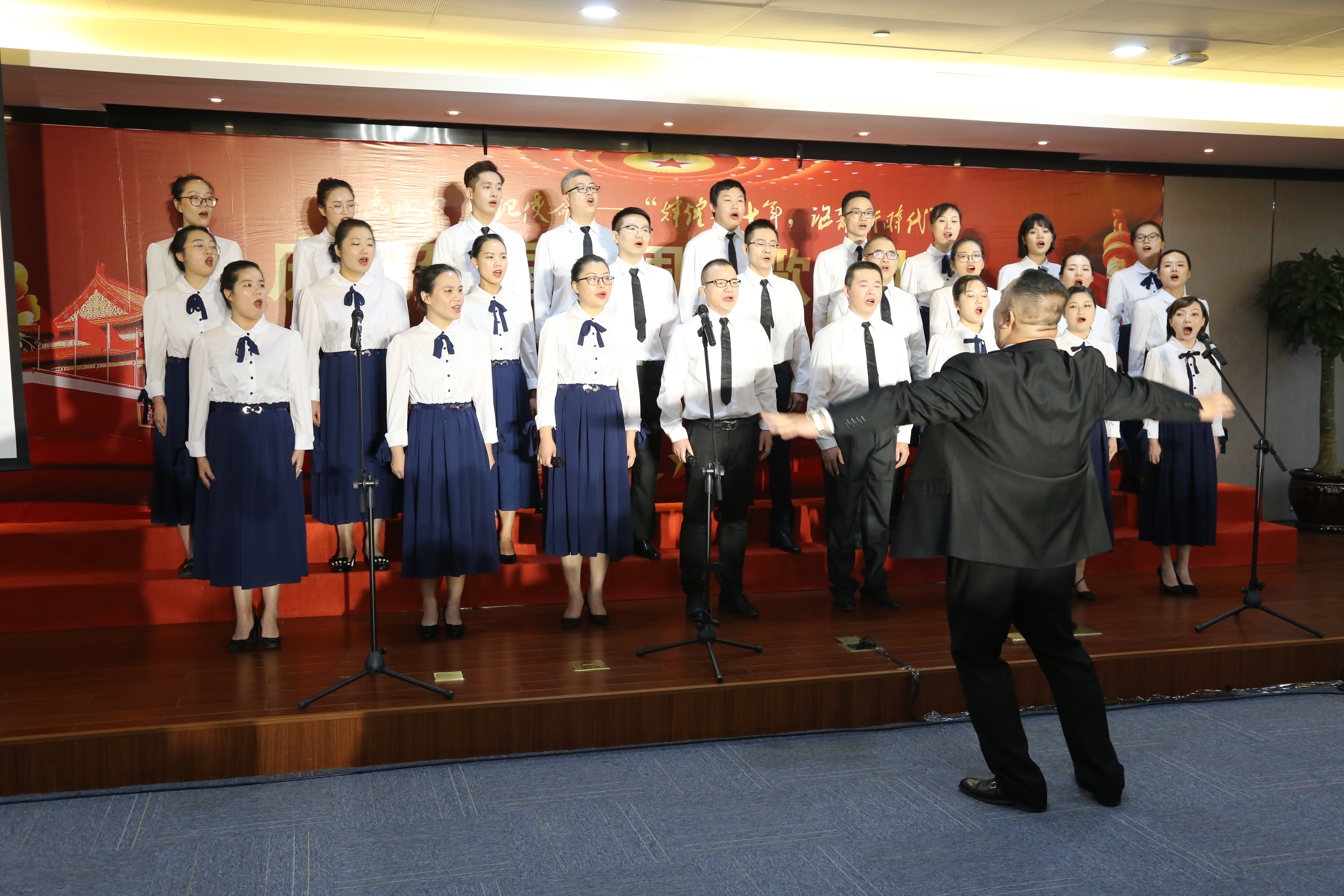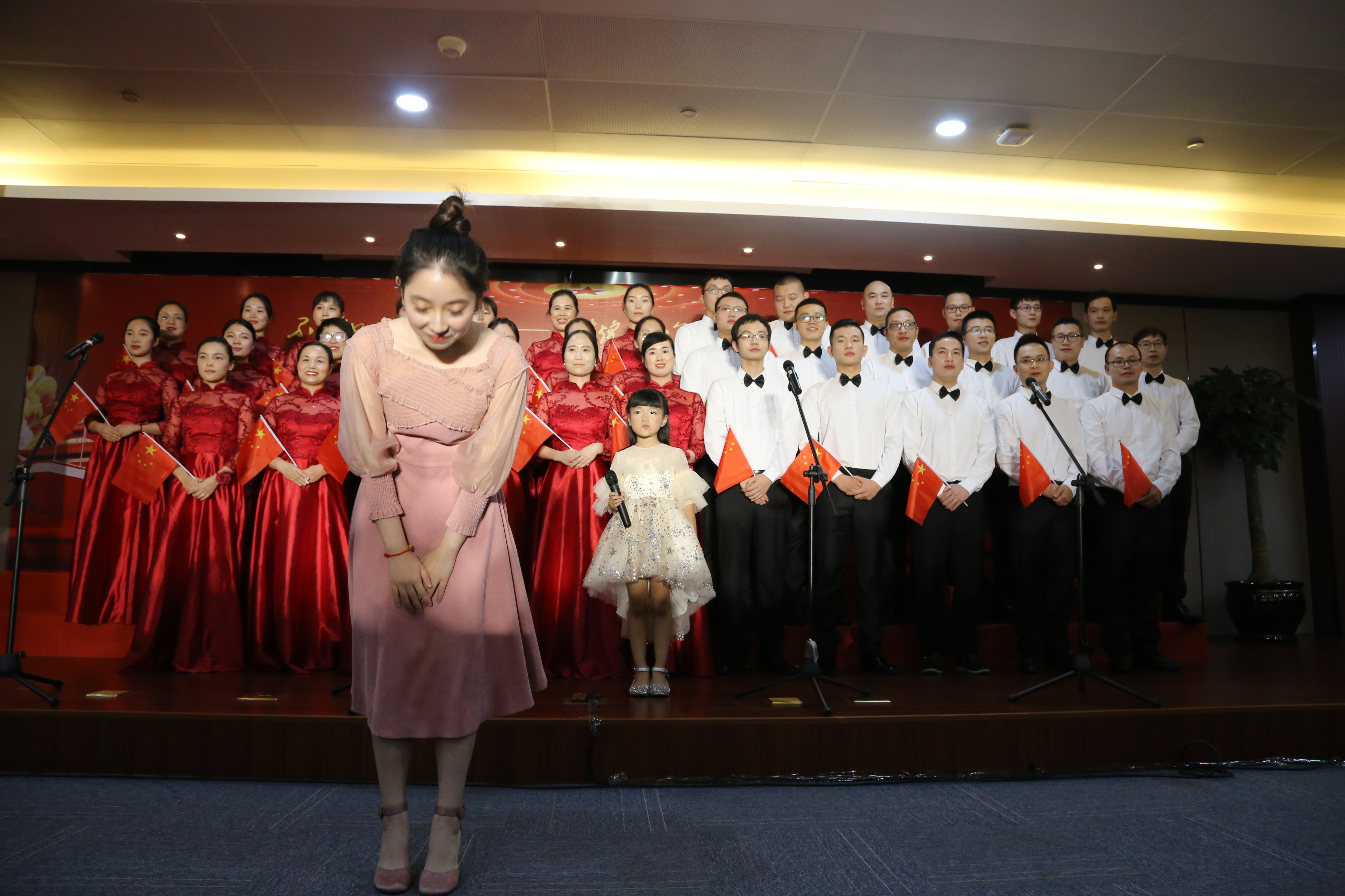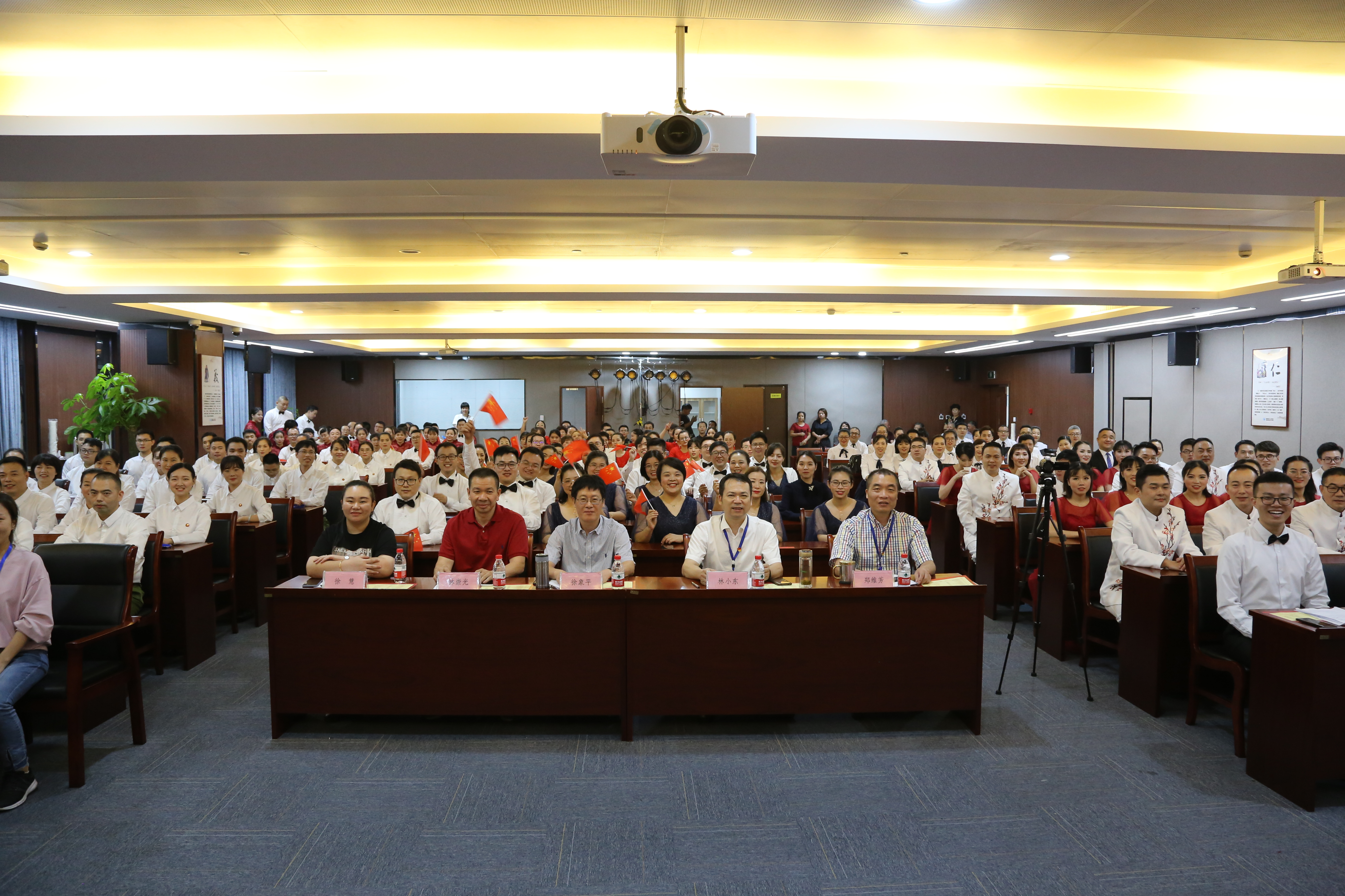 歌詠誦讀會在陳靖、方春霞、曹文虎、林飛飛的領唱下,在全場肅立、全體人員揮舞著五星紅旗,高唱《我和我的祖國》的歌聲中完美落幕。