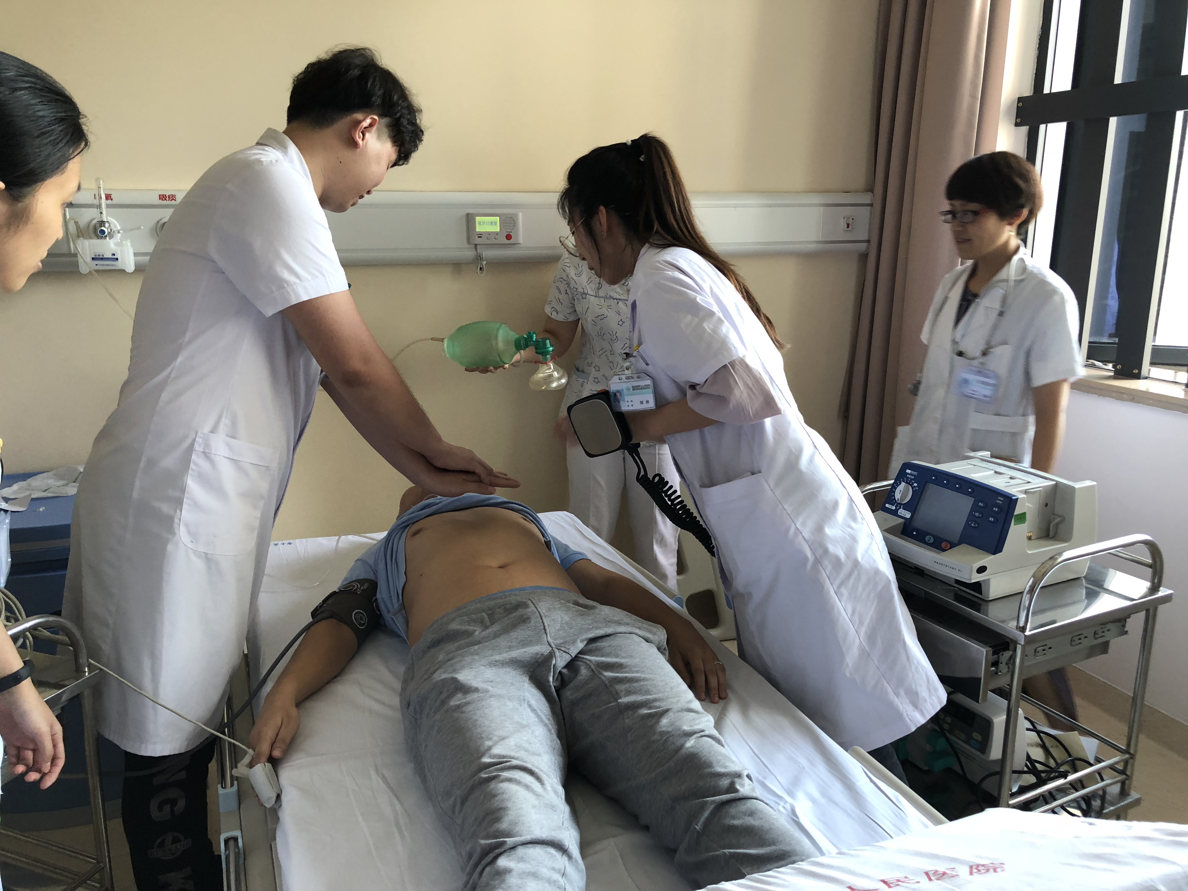 在應(yīng)急演練過程中,病人出現(xiàn)突發(fā)情況,醫(yī)生予護(hù)士立即展開搶救工作。加強(qiáng)醫(yī)護(hù)的急救意識(shí),做到與“死神”賽跑。