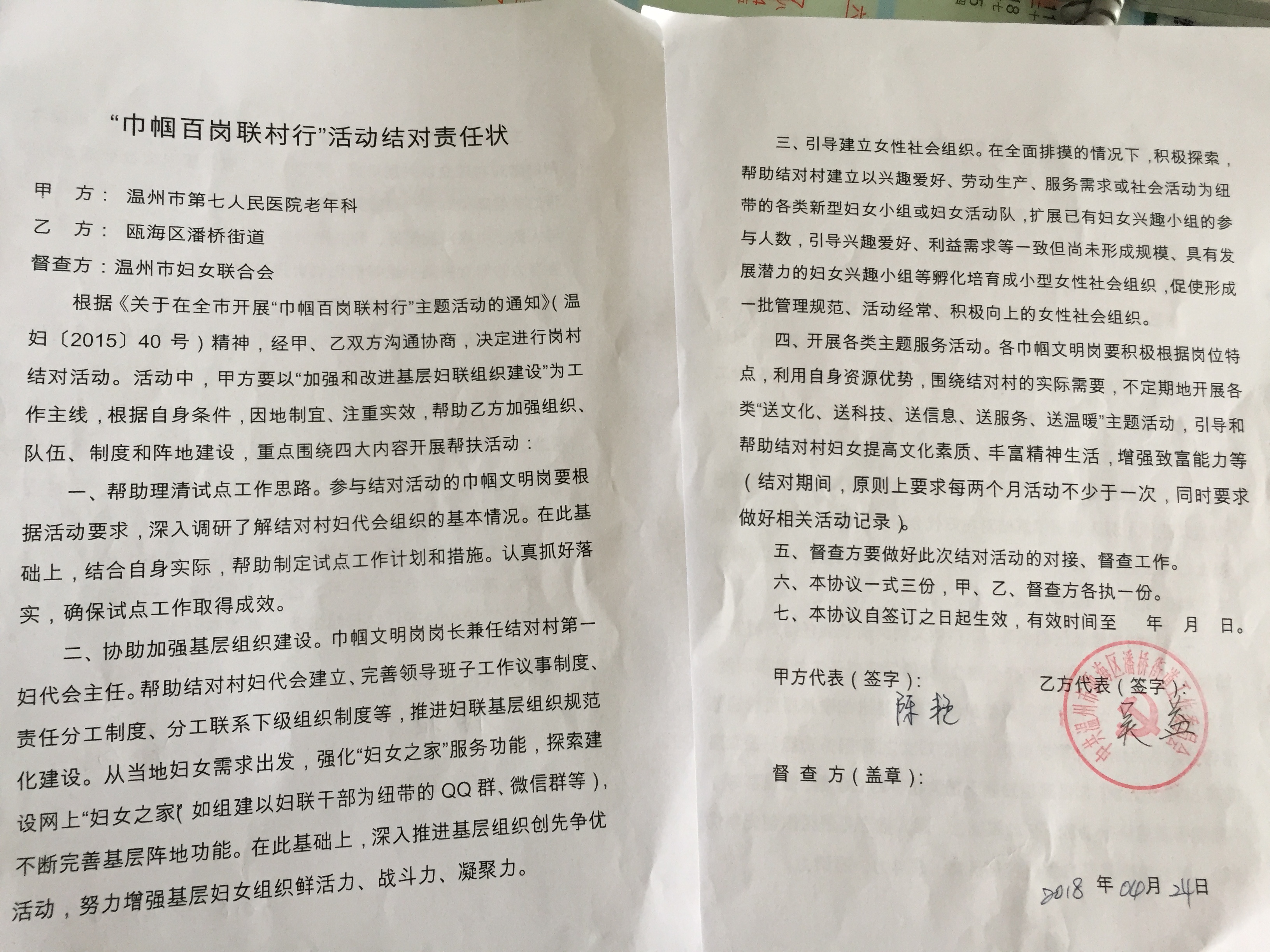 ?4月24日上午,我院老年科巾幗文明崗崗長(zhǎng)陳艷副護(hù)士長(zhǎng),協(xié)同土文珍主任、陳光東副主任前往潘橋街道辦事處,與潘橋街道簽下結(jié)對(duì)責(zé)任書,正式啟動(dòng)“巾幗文明崗崗村結(jié)對(duì)“活動(dòng),大力弘揚(yáng)志愿精神。雙方代表對(duì)結(jié)對(duì)的活動(dòng)作了初步的介紹,并表示要把結(jié)對(duì)共建活動(dòng)作為一項(xiàng)常態(tài)工作,保持連續(xù)性、系統(tǒng)性,充分發(fā)揮雙方的資源長(zhǎng)處和優(yōu)勢(shì),切實(shí)做到每?jī)稍虏簧儆谝淮蔚慕】祷顒?dòng),以扎實(shí)的舉措促進(jìn)整體聯(lián)動(dòng)。