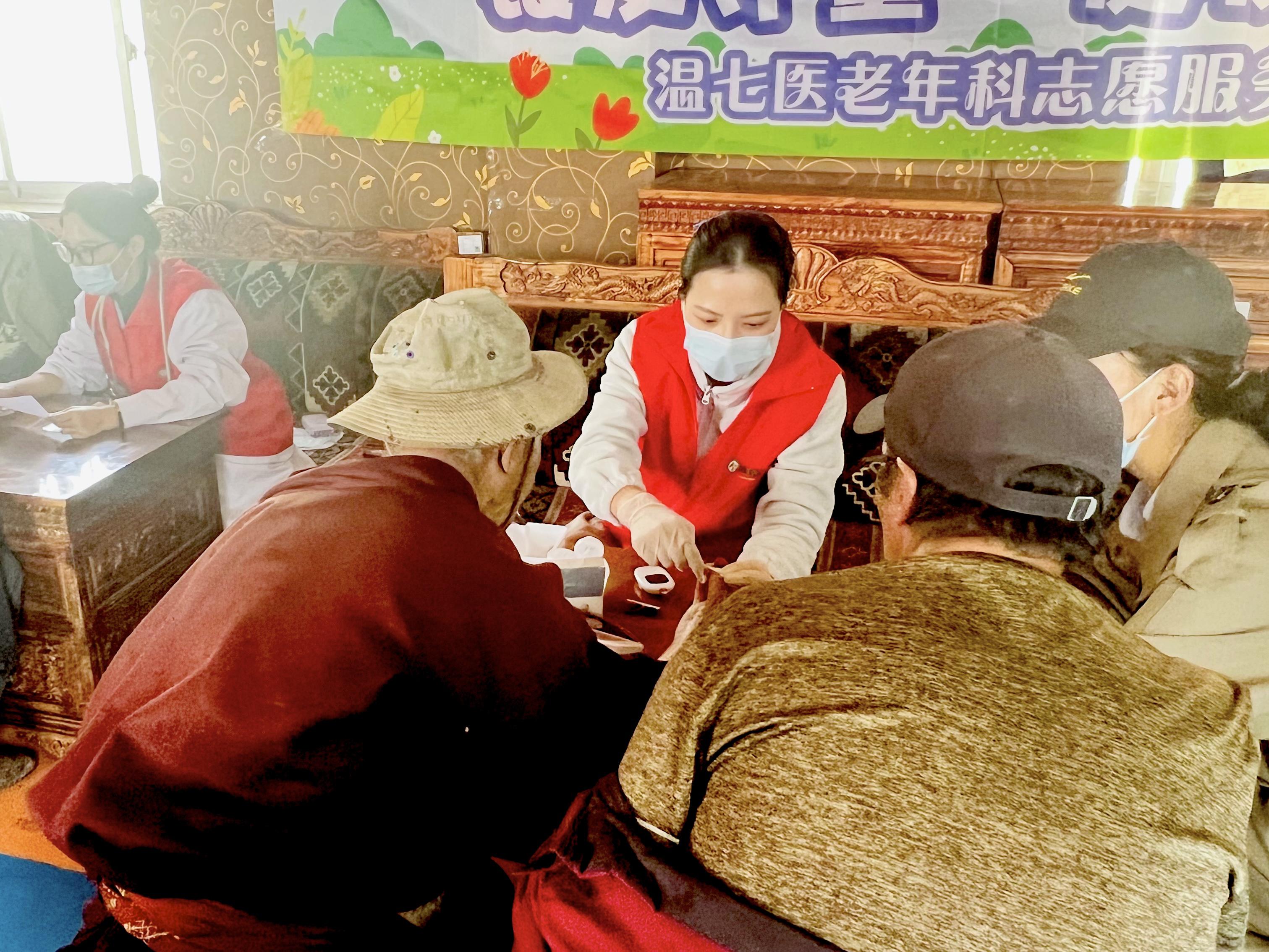 服務(wù)隊(duì)為這些老人進(jìn)行了常規(guī)體檢,對(duì)于發(fā)現(xiàn)的血壓高、血糖高等問(wèn)題,給予用藥以及生活指導(dǎo)。在義診過(guò)程中,老年精神科副護(hù)士長(zhǎng)周斯拉發(fā)現(xiàn),不少老人因?yàn)楠?dú)居,平時(shí)缺乏與他人的溝通,存在不同程度的心理問(wèn)題。其中一名藏民表現(xiàn)特別明顯,與其他藏民積極參與體檢不同,她較為消極,甚至有些躲避。志愿者見(jiàn)狀,便拉著她的手一直交流。在取得了老人的信任后,志愿者從老人的口中了解了她的故事。原來(lái),導(dǎo)致她如今冷漠的原因是身邊的親人相繼離世,朋友也逐漸減少。經(jīng)過(guò)一對(duì)一的心理疏導(dǎo),志愿者為老人解開(kāi)了心結(jié),她的臉上展露了笑容。